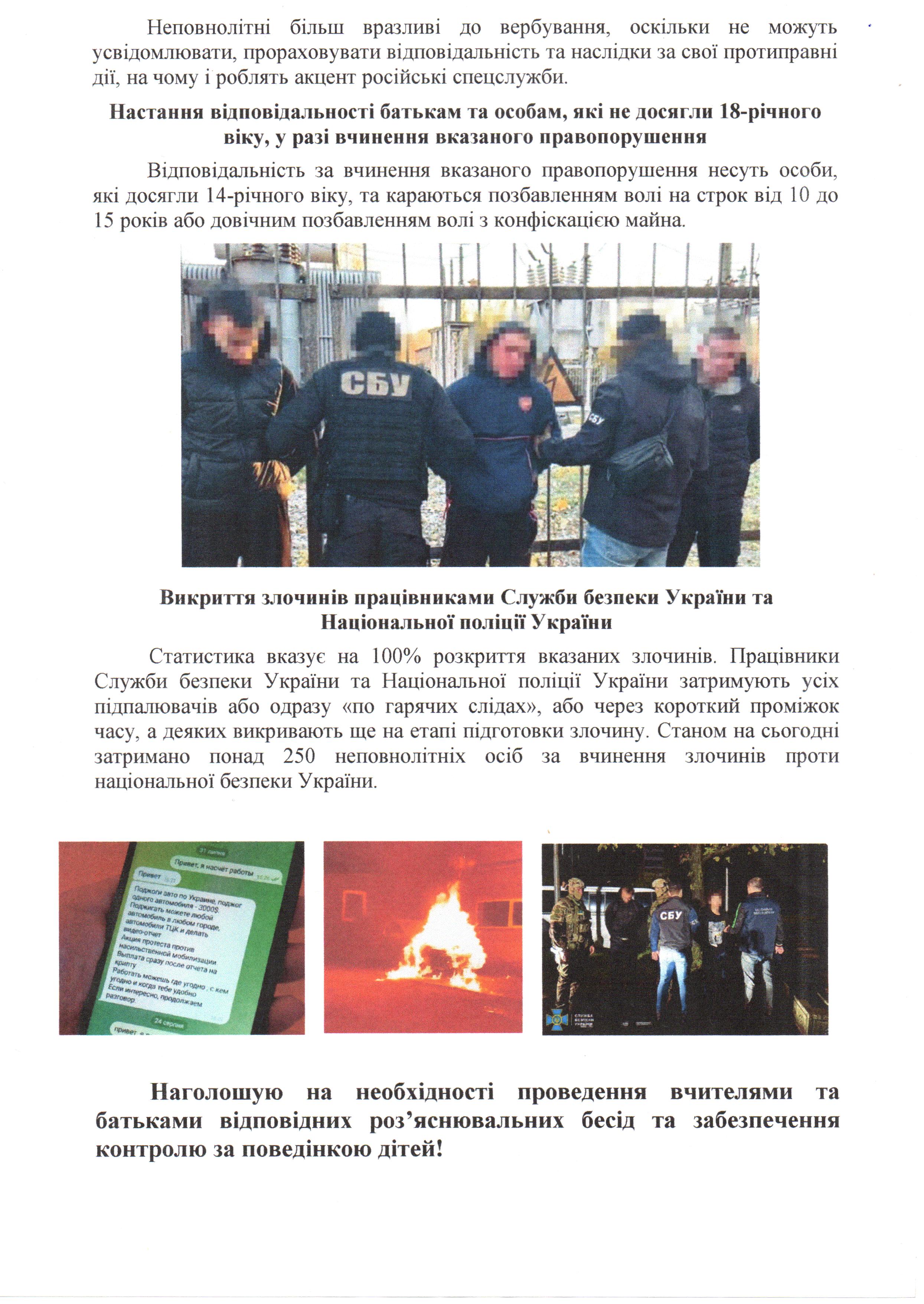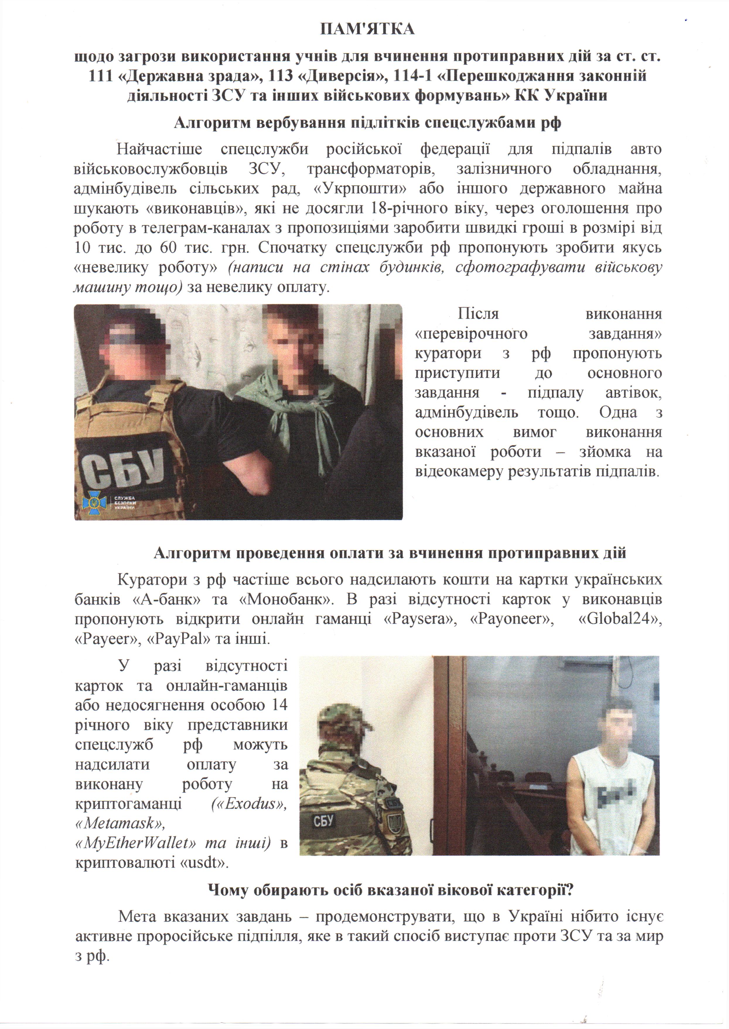 щодо загрози використання учнів для вчинення протиправних дій за ст. ст. 111 «Державна зрада», 113 «Диверсія», 114-1 «Перешкоджання законній діяльності ЗСУ та інших військових формувань», 258 «Терористичний акт» КК України